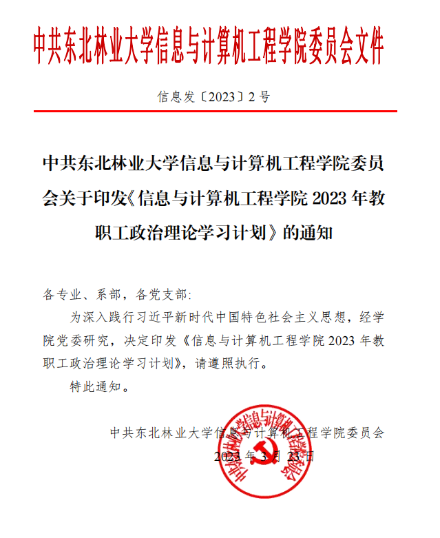 中共437437必赢国际网址信息与计算机工程学院委员会关于印发《信息与计算机工程学院2023年教职工政治理论学习计划》的通知
