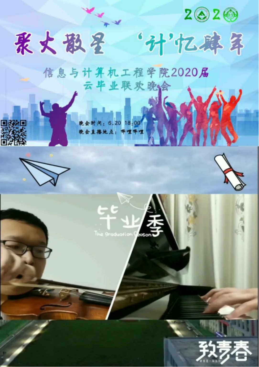 一场没有毕业晚会的毕业多少是有些遗憾的。在此惜别之际,信息与计算机工程学院学生会为2020届毕业生们准备了“聚火散星,‘计’忆肆年”云毕业晚会。14个节目,装载着来自信息与计算机工程学院全体教师最真切的祝福,以及学弟学妹们最衷心的送别。为2020届毕业生们的校园生活画上圆满的句号!