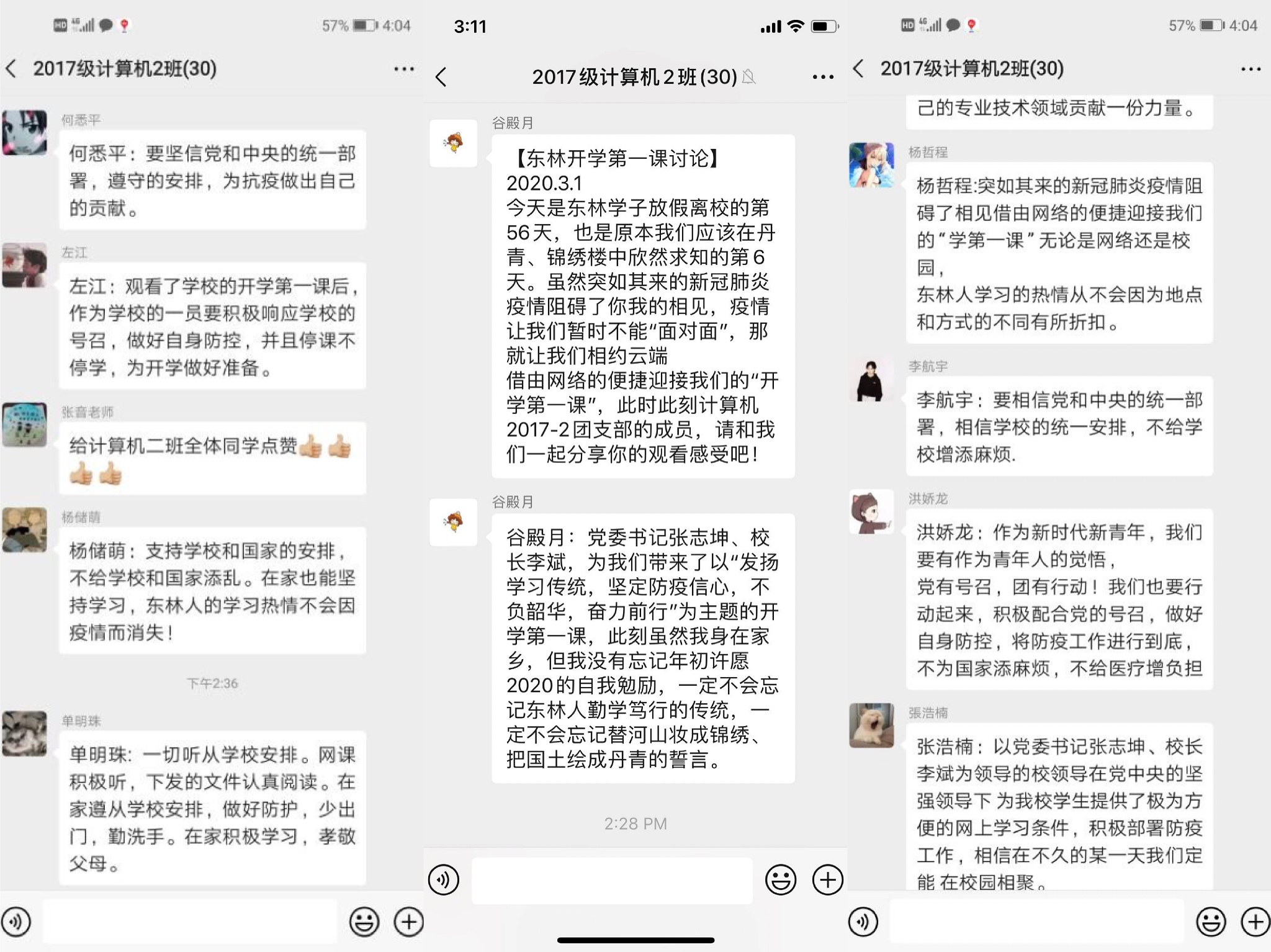 2017级计算机科学与技术2班谷殿月同学说:党委书记张志坤、校长李斌,为我们带来了以“发扬学习传统,坚定防疫信心,不负韶华,奋力前行”为主题的开学第一课,此刻虽然我身在家乡,但我没有忘记年初许愿2020的自我勉励,一定不会忘记东林人勤学笃行的传统,一定不会忘记替河山妆成锦绣、把国土绘成丹青的誓言。