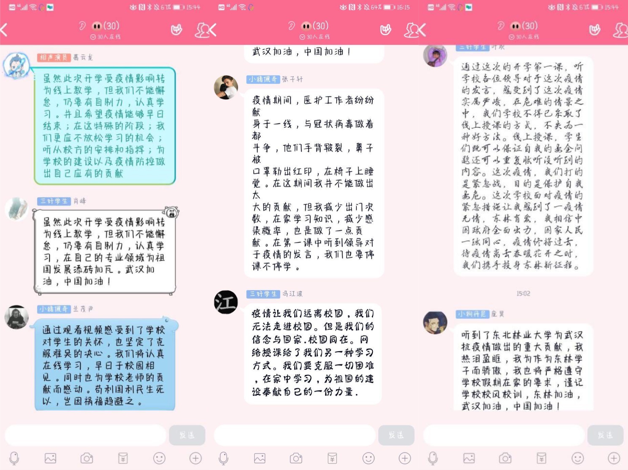 2016级信息管理与信息系统2班罗玉溪同学说:今天下午2点,我准时参加了学校以网络直播的形式召开的春季学期“开学第一课”。作为青年学生,我们是国家的后备力量,我们要相信祖国,相信自己,从小事做起,让我们一起携手抗击疫情,努力学习,为中国的富强尽一份自己的力量。在家准时上线收听学校安排的直播课程,按时完成学业,严于律己,养成良好的学习习惯。相信我们一定能战胜疫情,因为我们不仅背后有党和国家作为我们坚强的后盾,还有许许多多为疫情奋战的医护人员,和一群群的志愿者们,我向他们致以崇高的敬意!战胜病魔,我们一起加油。愿所有的幸福不负归期,愿所有的美好如期而至。愿前线英雄早日归来,愿疫情早日得到控制。武汉加油!中国加油!
