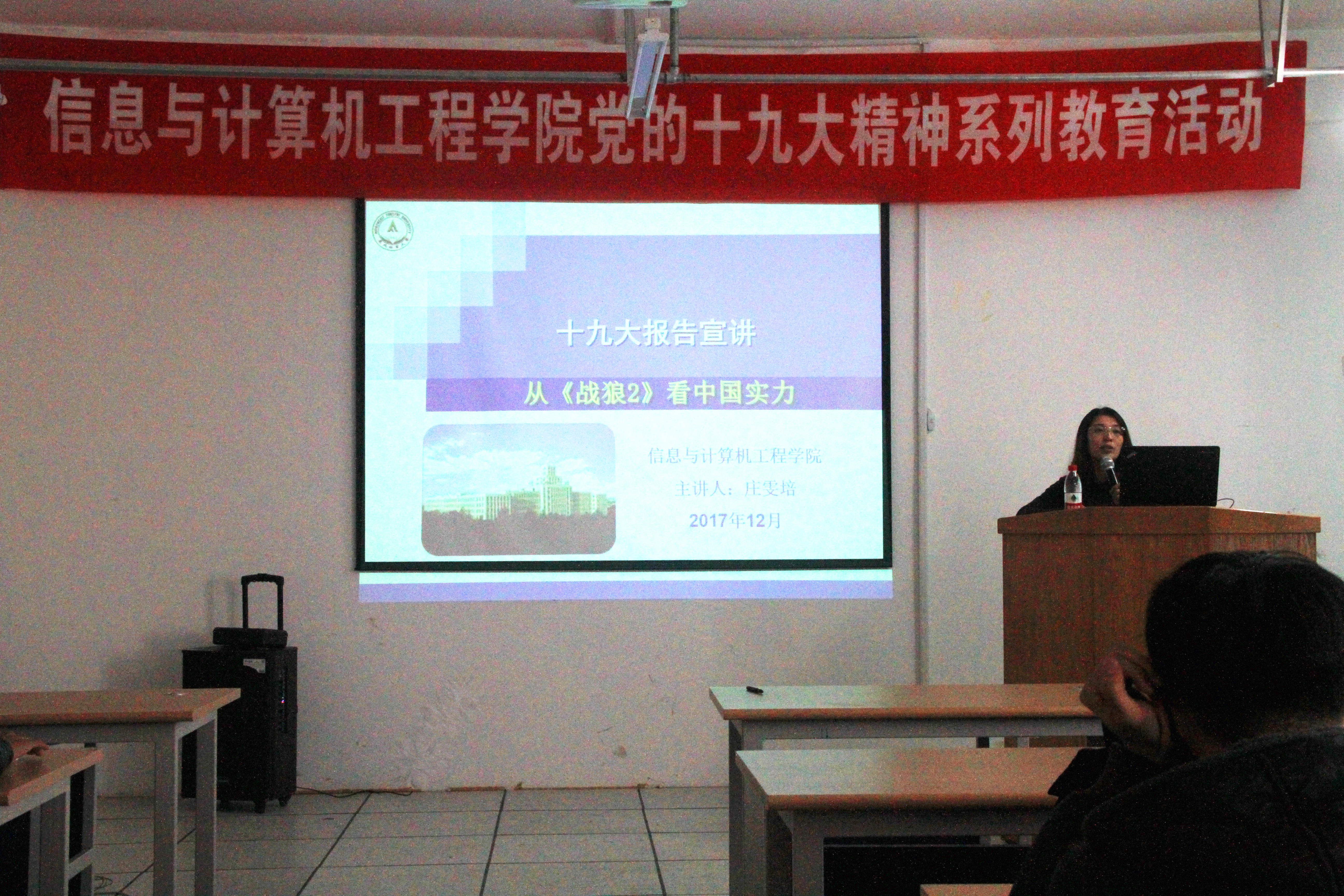 12月22日,为深入学习贯彻党的十九大精神,检验十九大精神学习阶段性效果,做到学思践悟、学以致用,信息学院举办学生干部学十九大精神专题活动。本次活动邀请到校十九大精神宣讲团成员、学院团委书记庄雯培老师作题为“从《战狼2》看中国实力”主题报告。学院全体团支部书记、班长参加了本次报告会。