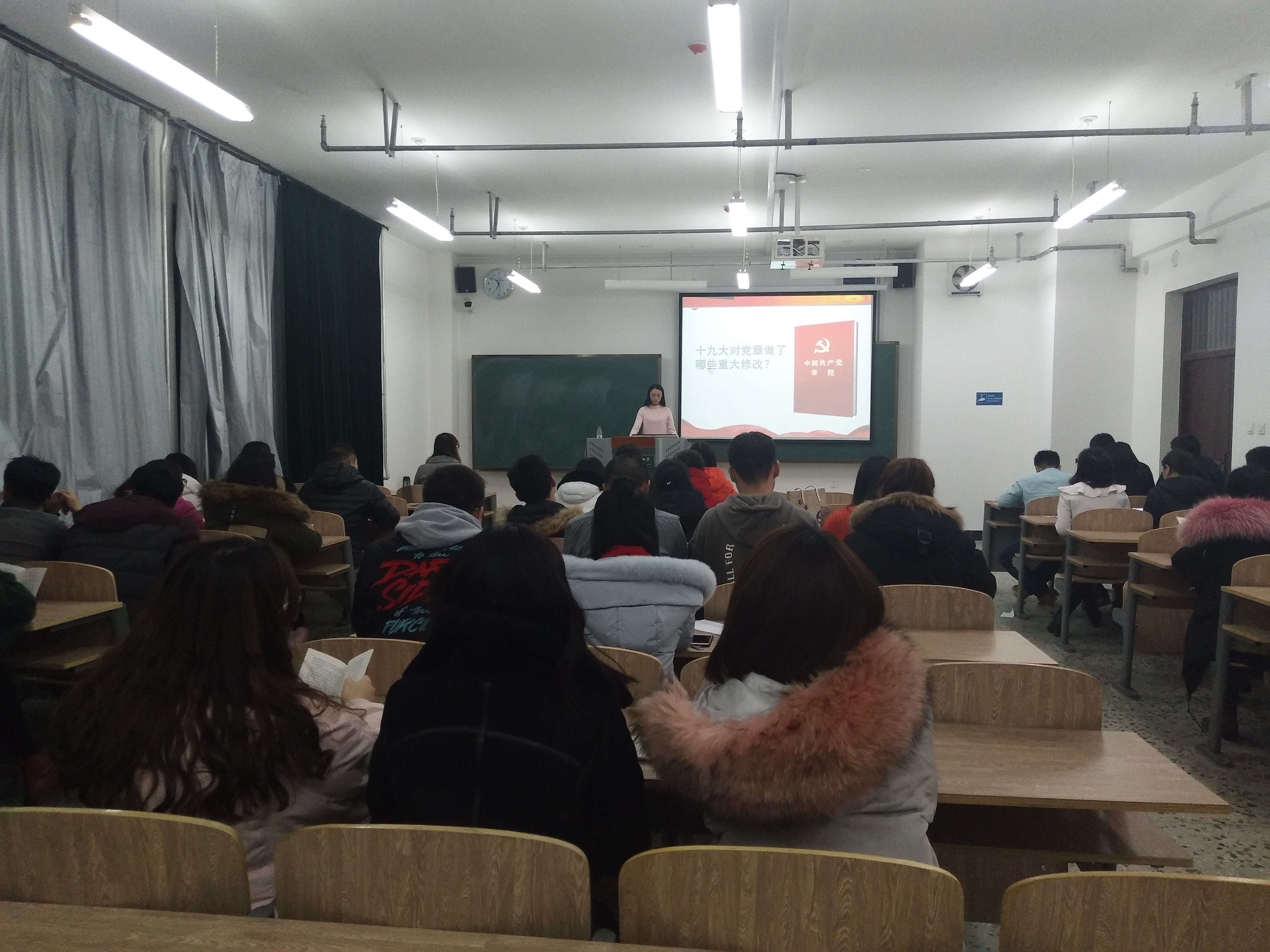 2017年12月13日信息学院研究生党支部在成栋楼407开展了学习新党章党课学习活动,此次活动由信息学院研究生第二党支部书记李晓霜主讲,信息学院研究生全体党员参加了此次学习活动。