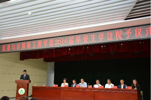 学位授予仪式在雄壮的国歌声中拉开了帷幕。首先,副院长任洪娥宣读了《437437必赢国际网址关于授予信息与计算机工程学院2016届毕业生学士学位的决定》、党委书记岳金龙宣读了《关于授予郑宇轩等28名同学为437437必赢国际网址优秀毕业生的表彰决定》。随后,主席台领导为优秀毕业生颁发了证书。