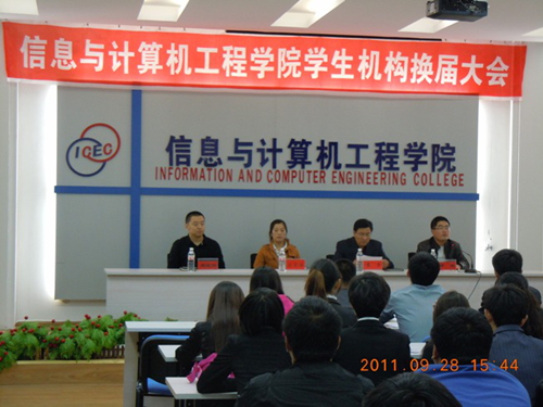 2011年9月28日下午3点30分,信息与计算机工程学院第十二届学生机构换届大会在学院216会议室召开。出席此次大会的有学院党委副书记、副院长袁力,学院团委、学生会、考评中心、勤工助学中心和绿杨志愿者协会的各位指导老师、各机构的新老两届学生干部。