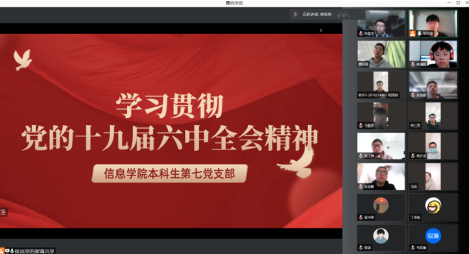 信息学院党委于11月12日上午10时组织学院各党支部认真学习了中国共产党第十九届中央委员会第六次全体会议精神,并开展热烈讨论。其中,学院6个教工党支部,12个学生党支部均采取线上观看的方式收看大会。
