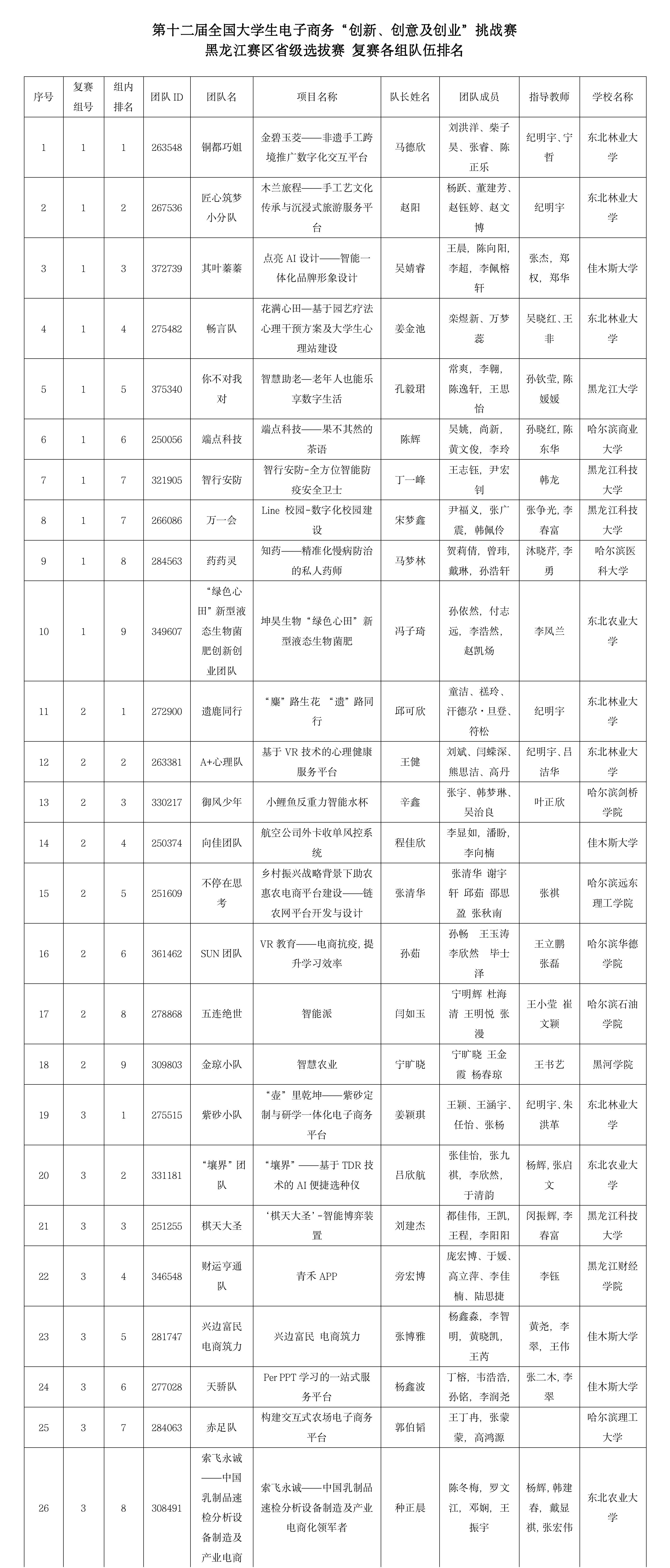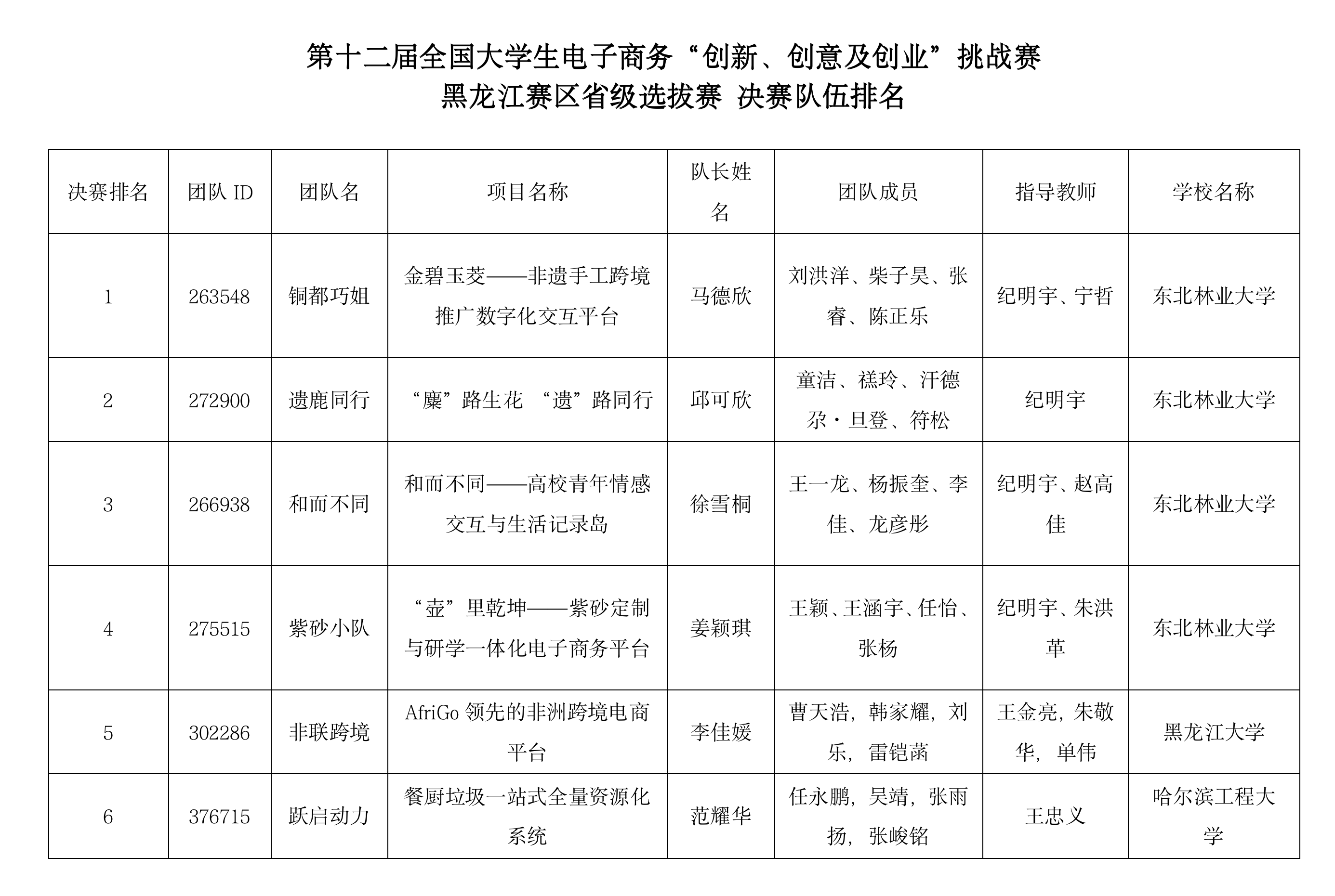 附:第十二届全国大学生电子商务“创新、创意及创业”挑战赛黑龙江赛区省级选拔赛队伍排名