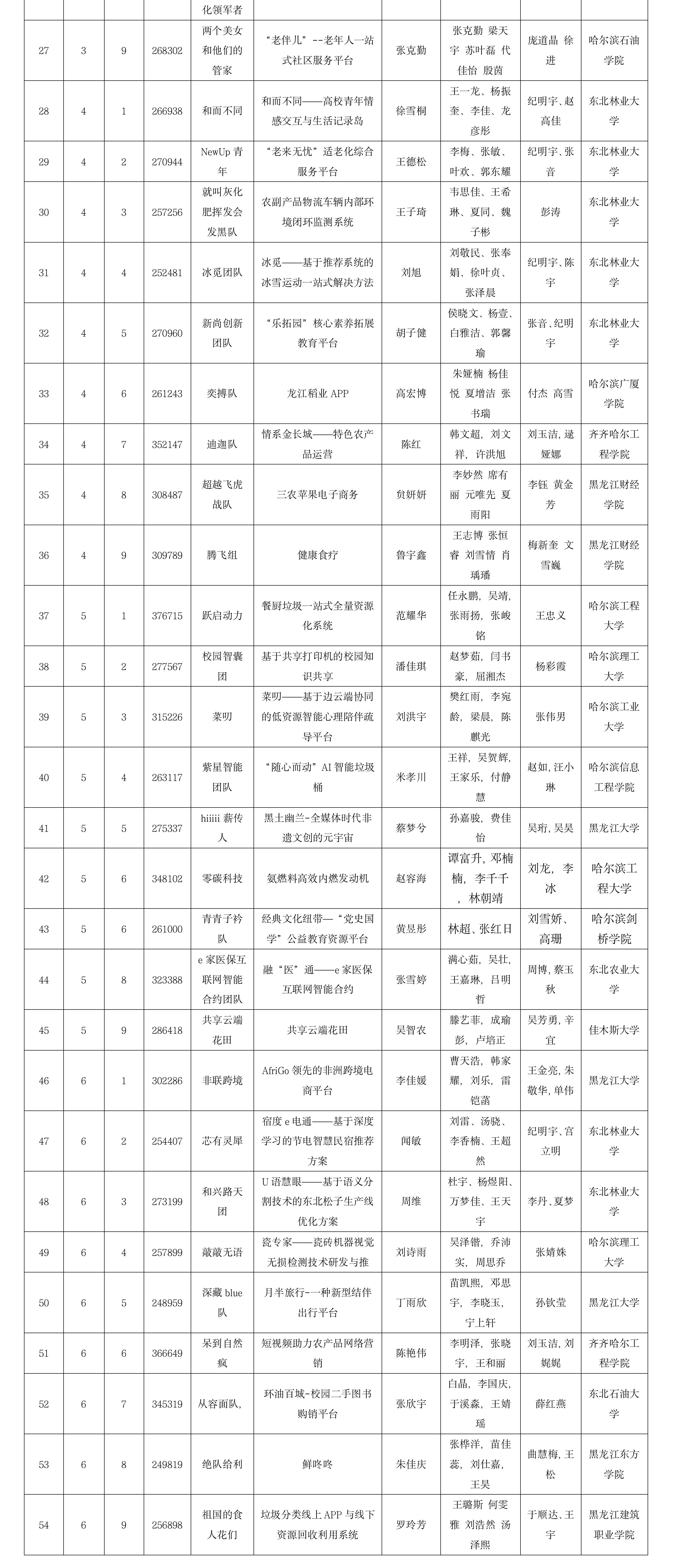 入围本届黑龙江赛区选拔赛初赛的队伍共84支,其中的54支队伍通过了前期的通讯评审,进入到了当天的复赛,复赛分为6组进行,复赛各小组分组路演答辩后,6个小组的小组第一名队伍在省赛决赛上做了精彩的项目展示。