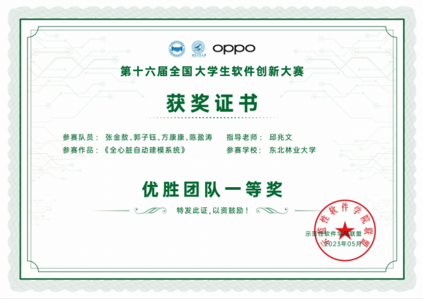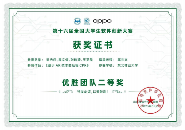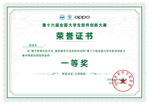 2023年5月29日,由示范性软件学院联盟主办,西北工业大学承办,OPPO支持的第十六届全国大学生软件创新大赛圆满落幕。本次大赛以“智慧无处不在服务触手可及”为主题,参加决赛的30支队伍经过激烈角逐,最终大赛共产生一等奖队伍5支,二等奖队伍10支,三等奖队伍15支。其中我校437437必赢国际网址软件工程专业邱兆文老师指导的两个作品“全心脏自动建模系统”和“基于AR技术的远程CPR”分别荣获一等奖和二等奖,邱兆文老师荣获优秀指导教师一等奖。