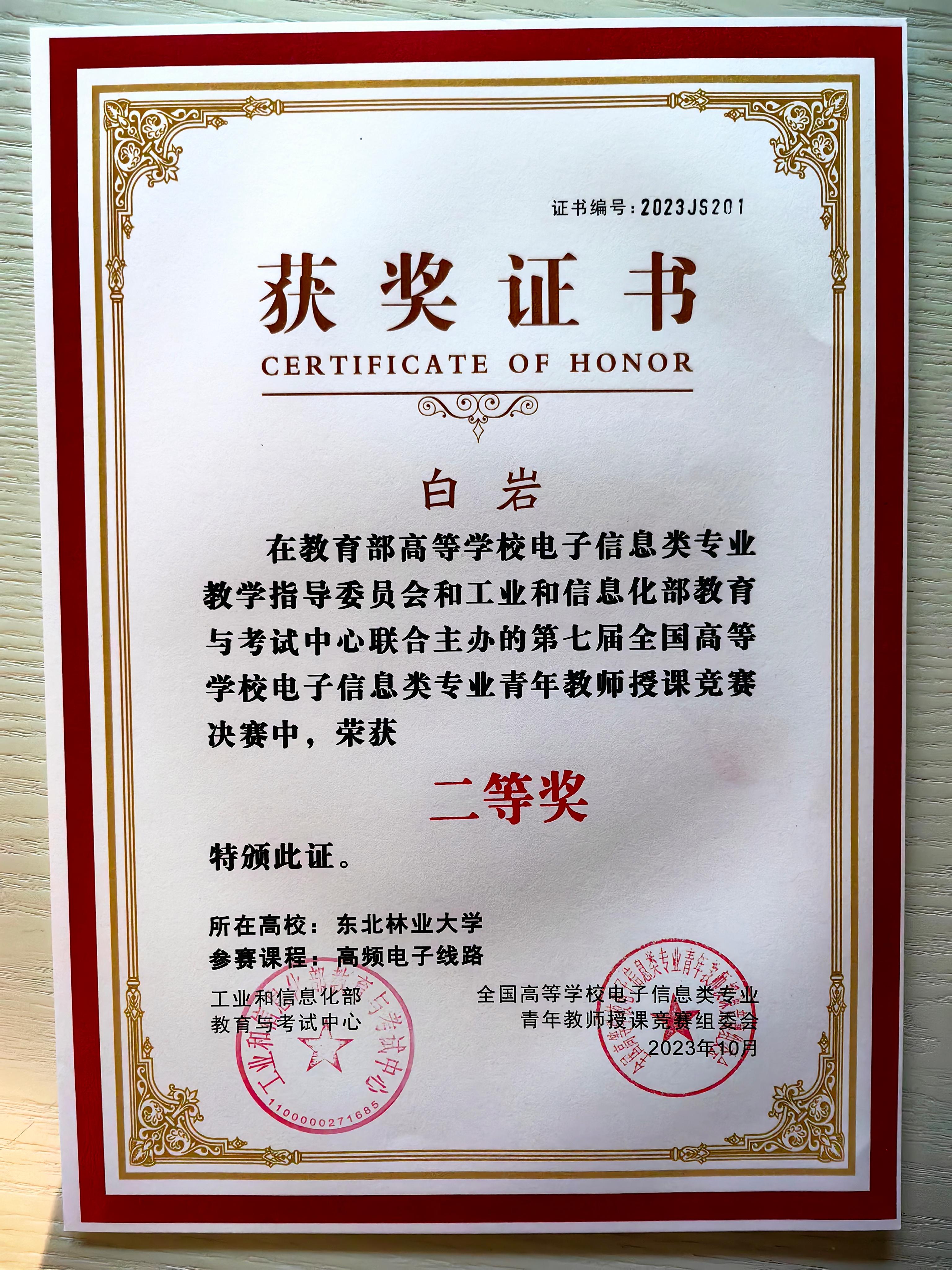 全国高等学校电子信息类专业青年教师授课竞赛由教育部高等学校电子信息类专业教学指导委员会以及工业和信息化部教育与考试中心联合举办,今年4月份启动以来,共有来自25个省、直辖市、自治区的190所高校、700余名教师报名参赛,经过分赛区评比,来自四川大学、武汉大学、哈尔滨工业大学等63所高校的107位教师进入决赛。决赛于2023年10月22日顺利结束,经过现场评比,决出一等奖21人(含特等奖1人),二等奖35人,三等奖50人。经过现场抽签、授课、微课展示等环节,我校437437必赢国际网址教师白岩副教授获二等奖。近年来437437必赢国际网址注重教师教学技能的培养,通过教师培训、互动研讨、个性化指导、定期评估、反馈改进等一系列举措提升教师授课能力与授课水平,全面提升教师的教育教学水平和科研能力。