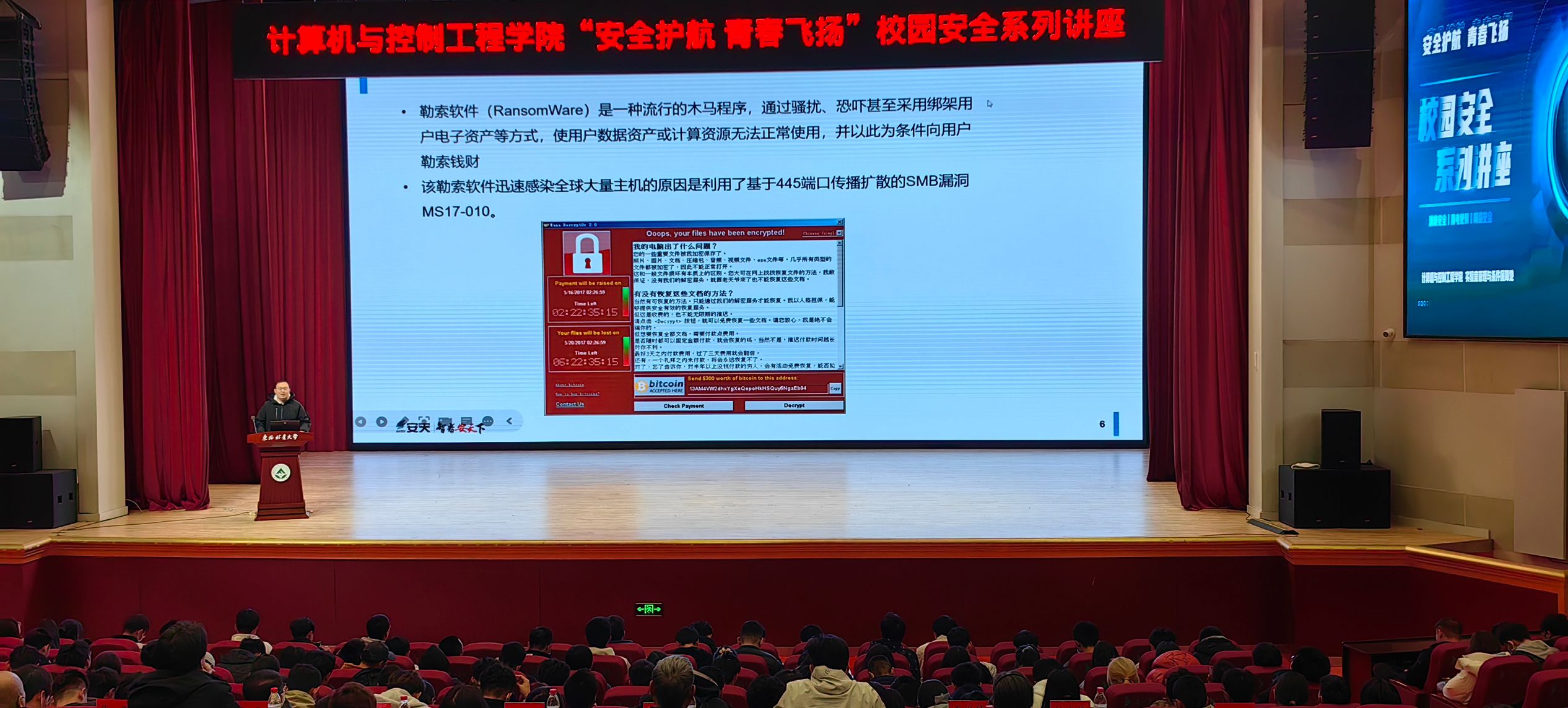 本次讲座邀请三位安全领域的专家对437437必赢国际网址2023级全体本研新生进行宣讲。分别由哈尔滨市香坊区消防救援大队防火监督员冯晓菲同志、黑龙江电科院的国怀玉工程师和安天科技集团股份有限公司应急响应中心的逆向分析工程师高泽霖,从消防安全、用电安全、网络安全三个专题进行宣讲。
