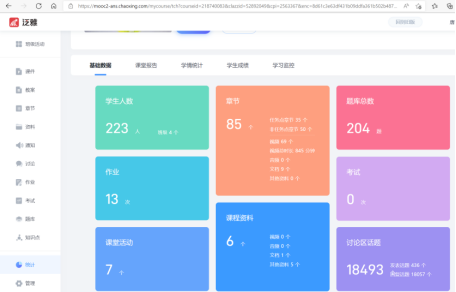 同时,通过平台的统计功能分析学生对线上课程资源的使用情况,统计学生学习状况,教师通过后台实时观察学生的学习情况,及时跟进学习进度缓慢的学生。平台统计模块如图5所示。