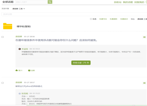 另外平台上还设置了线上讨论区,其用意是让学生成为学习的主体,锻炼学生的思维能力和语言组织、表达能力。这些讨论和作业充分利用了成果驱动的教学方法,保障了在线学习的质量,体现创新性、高阶性和挑战度要求。另外,一些精彩的作业在线上设置集中展示区,可以用榜样的力量带动学生的线上学习氛围。讨论内容如图4所示。