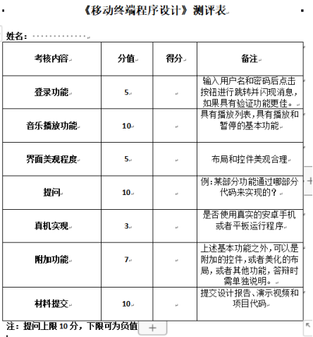 (1) 探究线上考核方式,结合课程实际情况,取消期末笔试,改为应用能力考核。考核内容为:开发一个音乐播放器APP,要求具有登录界面,在登录界面输入用户名和密码后点击登录按钮进行跳转。成功登录后,具有歌曲列表,点击相应歌曲后进入播放界面,播放界面具有播放、暂停的基本功能。不限于上述基本功能,在此基础进行扩展可以具有附加分值。鼓励使用真机进行程序的操作。制定评分细则,确保能够将作品成绩全面客观地体现出来。设计的打分表格如下: